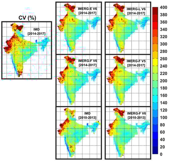 The spatial distributions of CV from the rain-gauge-based dataset and IMERG products across India for the southwest monsoon season are illustrated in Figure 5. As expected, a larger magnitude of CV over the lower mean monsoon rainfall regions and smaller CV over the higher mean rainfall regions are depicted by both rain-gauge-based and multi-satellite products qualitatively. However, three Runs of IMERG V6 generally show a smaller magnitude of CV by 50–90% as compared to the rain-gauge-based product. IMERG-F V5 appears to be marginally better than IMERG-F V6 in terms of CV. Moreover, CV depicted by IMERG-F V6 during the pre-GPM period, is closer to observations as compared to the GPM period.