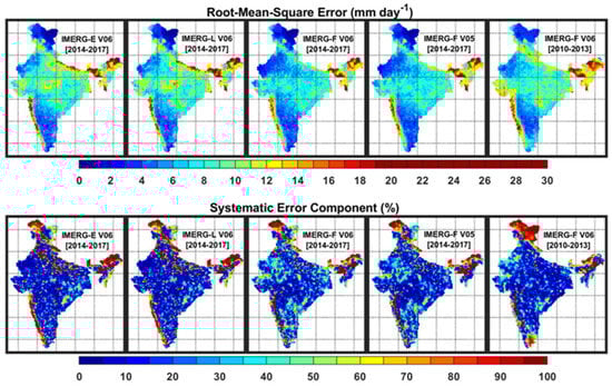 The spatial distributions of RMSE and the systematic error component for IMERG products as compared to the rain-gauge-based dataset are presented in Figure 6. As the sum of systematic and random error components is always 100%, the random error component can be determined by visualizing the systematic error component. Therefore, the random error component has not been shown in the figure. In general, the magnitude of RMSE in IMERG estimates is larger over the higher mean rainfall regions and vice versa. However, IMERG-E and IMERG-L show higher RMSE than the IMERG-F product. Although IMERG-F V6 does not show any notable improvement in RMSE than IMERG-F V5, the magnitude of RMSE is notably smaller in IMERG-F V6 during the GPM period (2014–2017) than the pre-GPM period (2010–2013). Larger systematic errors in IMERG products can be seen primarily over the orographic regions of the west coast, northeast, and northern India. Near-real-time IMERG products have the smallest systematic error as compared to the IMERG-F product. However, IMERG-F V6 has a larger systematic error than IMERG-F V5. Additionally, the systematic error is smaller in IMERG-F V6 across the country except for the southeast peninsular India during the pre-GPM period than the GPM period. This analysis suggests that the IMERG-F V6 product needs a suitable bias correction before its integration in any specific application, particularly for the GPM period. However, it would be interesting to examine the sources of errors in IMERG products using sub-daily scale precipitation analysis. Few studies over the US region showed that passive microwave sensors provide the most skillful estimates to IMERG, whereas infrared estimations have rather poor skill [,,].