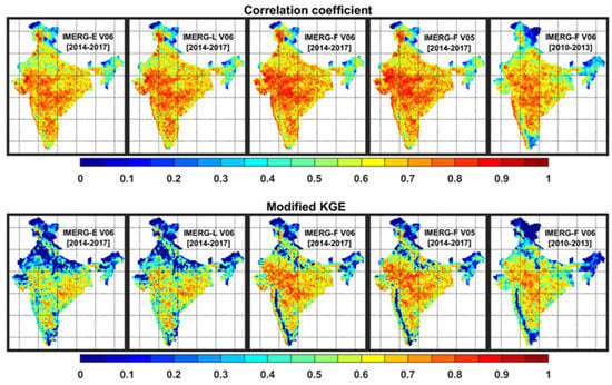 Figure 7 shows the spatial distributions of correlation coefficient and KGE for IMERG products as compared to the rain-gauge-based dataset across India. A smaller correlation coefficient in IMERG products has generally been found over the northern and northeastern parts of India. However, the research product of IMERG shows a higher correlation coefficient than near-real-time products. Both V5 and V6 estimates of IMERG-F show a similar correlation coefficient, but IMERF-F V6 has a larger correlation with the rain-gauge-based dataset during the GPM period than the pre-GPM period. The KGE score combines correlation, bias, and variability and gives equal weightage to each of the components. Therefore, a smaller KGE score has been seen in IMERG products over larger parts of the northern and northeastern parts of the country. It is also to be noted that the rain gauge density over the northern and northeastern parts is rather poor [], and rain gauge density plays a key role in the evaluation of any satellite-based precipitation product. Therefore, the error metrics over these sub-regions might have larger uncertainty. The pattern of KGE is similar to the bias pattern over the west coast in IMERG-F estimates. IMERG-F shows better performance than IMERG-E and IMERG-L. Overall, both near-real-time IMERG products have similar error characteristics in precipitation estimation. There is no noticeable change in error metrics in IMERG-F V6 as compared to V5. However, IMERG-F V6 exhibits better performance during the GPM period (2014–2017) than the pre-GPM period (2010–2013).