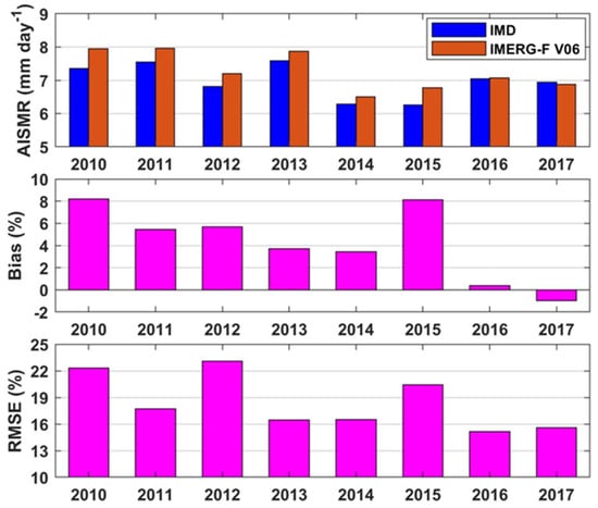 Since monsoon rainfall shows prominent interannual variability, bias and RMSE in all-India monsoon rainfall from IMERG-F V6 for 2010–2017 has been computed for each year separately to investigate the reason for larger bias and error in the multi-satellite estimates during the pre-GPM period than the GPM period. Figure 8 presents yearly variations in all-India mean monsoon rainfall from both IMERG-F V6 and IMD rain-gauge-based data and bias and RMSE in the IMERG estimates. IMERG systematically overestimates all-India mean rainfall except for 2017. Bias is the largest during 2010 and 2015, whereas RMSE is the largest during 2010 and 2012. It indicates that bias and RMSE are not always linearly dependent. Much less bias during 2016 and 2017 with an opposite sign as compared to other years leads to smaller bias in IMERG-F V6 during the GPM period than the pre-GPM period. However, bias and RMSE in the IMERG-F V6 estimates do not show any clear evidence of their association with interannual variations of the all-India monsoon rainfall.