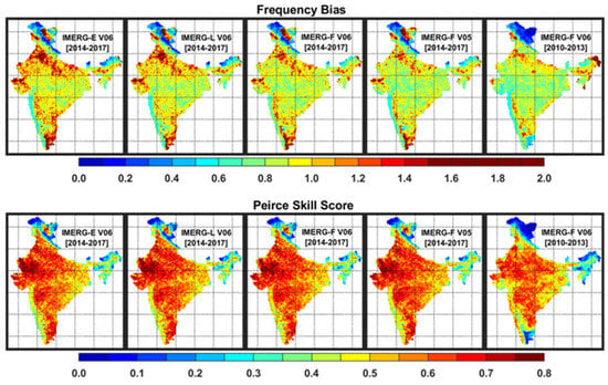 In this section, the capabilities of IMERG products have been assessed for the detection of rainy days over India. During the southwest monsoon period, daily rainfall less than 2.5 mm is considered as a non-rainy day according to the IMD convention. Therefore, a threshold of 2.5 mm day−1 is considered for the detection of rainy days from both multi-satellite and rain-gauge-based data. Figure 9 shows the spatial distributions of POD and FAR in IMERG products in the detection of rainy days across India, whereas FBI and PSS are shown in Figure 10. In general, higher POD and PSS and smaller FAR can be seen in IMERG products across the country except for few regions. IMERG products show smaller POD, FBI, and PSS and larger FAR over the northern India. Both near-real-time and research products show similar characteristics in the detection of rainy days. However, IMERG-F V6 shows marginal improvement over the IMERG-F V5 product. IMERG-F V6 shows notably better performance in rainy day detection during the GPM period than the pre-GPM period. Interestingly, POD is relatively smaller and FBI is rather larger in the IMERG suite over the orographic regions than the plain regions. It clearly indicates that satellite-based product performs better over the plain regions than orographic regions in the detection of monsoon rainy days. FAR in the IMERG suite is smaller over the windward side of the Western Ghats than the leeward side, but the opposite is true in the case of PSS. Over the hilly northern part of the country (Jammu and Kashmir region), IMERG products show exceptionally small POD, FBI, PSS, and large FAR as compared to the rain-gauge-based dataset. However, rain gauge density is meager over this high altitude region, and the rain-gauge-based gridded data might have larger uncertainty over this region.