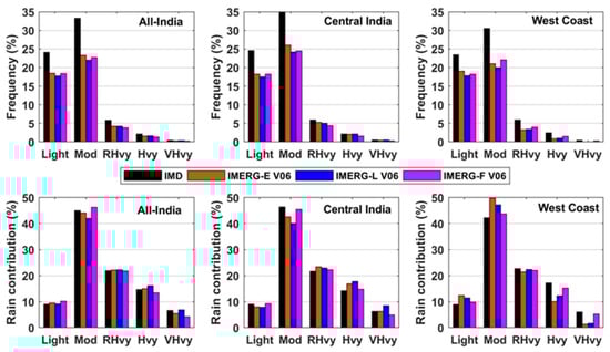 Frequency and contribution of different rainfall intensity intervals to the total monsoon rainfall for all-India, central India, and west coast from the IMD rain-gauge-based data and IMERG version 6 estimates for 2014–2017.