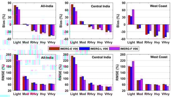 Bias and RMSE in IMERG estimates for different rainfall intensity intervals as compared to the IMD rain-gauge-based dataset is illustrated in Figure 12 for all-India, central India, and the west coast. The three IMERG estimates systematically overestimate light rainfall and underestimate rather heavy to very heavy rainfall. Additionally, RMSE is the largest for light rainfall, followed by moderate rainfall intensity. Interestingly, IMERG-F shows the largest bias and RMSE compared to IMERG-E and IMERG-L over the west coast in light rainfall estimation. It indicates that IMERG estimates under-detect and overestimate light rainfall, which needs to be improved in the next release. However, there is a notable reduction in bias in the IMERG-F product as compared to IMERG-E and IMERG-L products over the west coast for rather moderate to very heavy rainfall intensities. IMERG-L has a smaller magnitude of bias than IMERG-E and IMERG-F for rather heavy to very heavy rainfall intensities for all-India and central India but has the largest RMSE. These results clearly demonstrate the regional variations in error characteristics of IMERG products associated with distinct topography and precipitation processes.