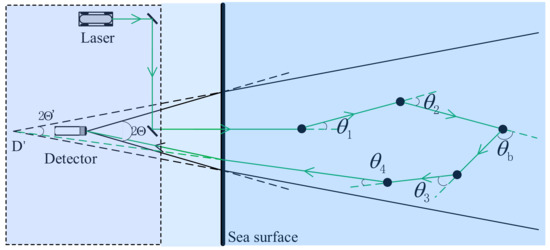 As depicted in Figure 1, a laser beam is received by a detector after multiple scattering in the water, where scattering at small angles is dominant. Under the framework of the quasi-single-scattering small-angle approximation (QSAA) [26], the received power is mainly composed of the multiple forward scatterings at small angles and a single backscattering at a large angle of nearly 180°.