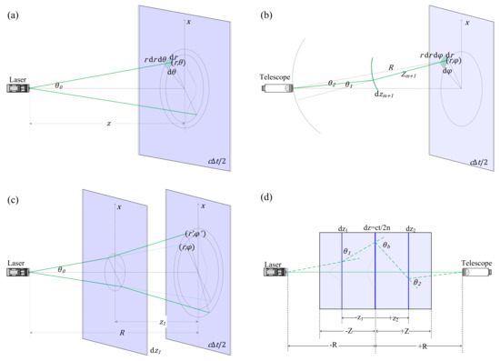 The geometry of lidar propagation. (a) Trajectory of a photon transmitted to the slab without scattering; (c) trajectory of a photon forward-scattered at a distance ; (b) trajectory of a photon propagating back to the telescope after back-scattering at the slab; (d) the unfolded multiple-scattering geometry of the lidar return.