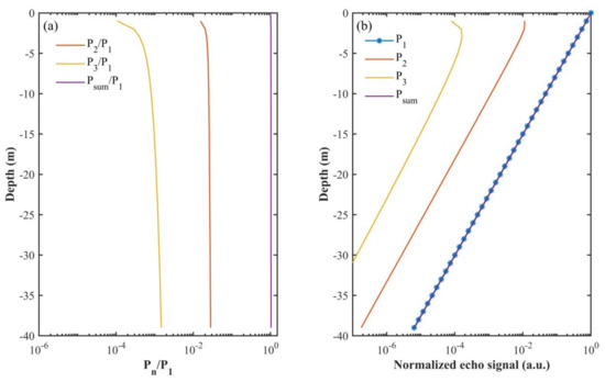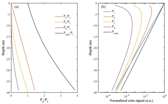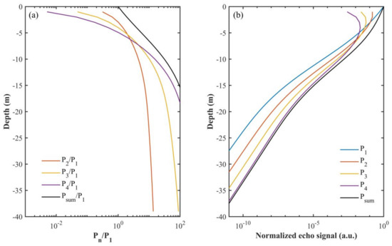 Effects of stratified seawater. (a) The ratios of double, three-order, and four-order scattering to single scattering; (b) the single, double, three-order, and four-order scattering, and total echo signals.
