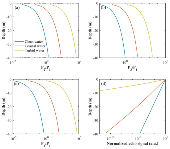 Multiple scattering has a great influence on the lidar echo signals, so the effects of multiple scattering need to be determined for accurate lidar signal processing. To address the multiple scattering during lidar transmission, we simulated the ratios of double, three-order, and four-order scattering to single scattering, and their signal intensity is simulated, as well (Figure 3). The parameters of the lidar system used are , , and the receiver aperture . The water optical properties of clear ocean shown in Table 1 are used here. As shown in Figure 3, when the laser beam enters the water, the echo signal is dominated by single scattering, while the contribution of multiple scattering is negligible. However, multiple scattering signal increases with the propagation of laser beam in the water. In particular, when the depth exceeds 27 m, the double scattering signal begins to be more than single scattering signal, and at this depth range, the dominating backscattered signal received by the lidar FOV is multiple scattering. However, the total signal magnitude decreases as the depth increases because of water attenuation. Some backward signal exists out of the FOV after huge amounts of multiple scattering, which causes the decreasing of the signal magnitude as well. The difference between the total echo signals and the single scattering signal is shown in the result, and it increases with the propagation of the laser beam, which indicates that the multiple scattering effect is not negligible for lidar inversion.