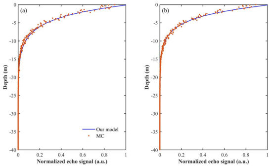Figure 12 shows the simulation results of stratified water. Compared with results of homogeneous water, which represent a linear decay in the logarithm coordinates as shown in Figure 3b, the echo signal in stratified water has a bulge at the depth of 10 m where the maximum Gaussian chlorophyll value is reached. Therefore, the subsurface chlorophyll maximum layer can be detected by using the bulge of lidar measurements [12,40]. Besides, the multiple scattering occurs more frequently, as shown in Figure 12a. Considering the worldwide stratification in the real marine environment, stratified water is supposed to be considered in lidar simulation.