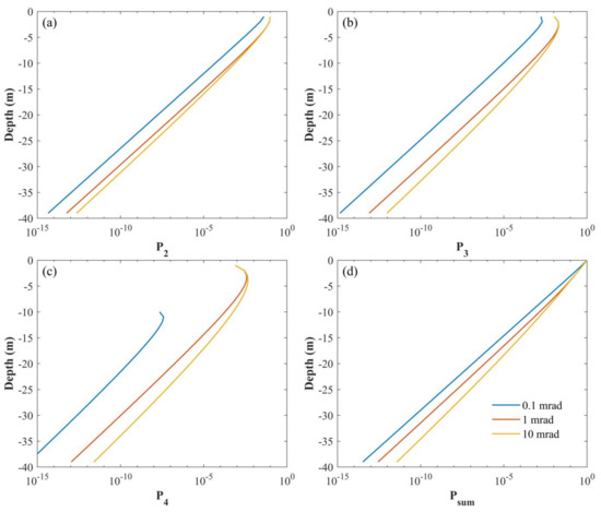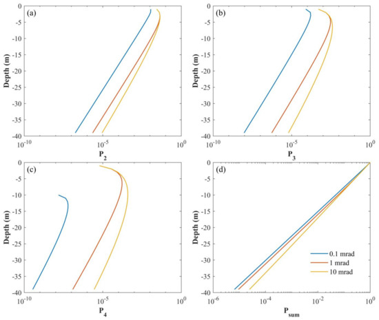 Figure 8 shows the results with FOVs of 10, 1, and 0.1 mrad in clear water. Figure 8a–d represent the double scattering, three-order scattering, four-order scattering, and the total echo signals, respectively. For a very small FOV of 0.1 mrad, the corresponding multiple scattering is so small that the total echo signal is mainly dominated by signal scattering. As the FOV increases, the multiple scattering increases, which leads to the result that the total echo signal decays more slowly with a larger FOV.
