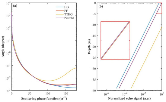 To analyze the effects of different SPFs, we simulated the lidar echo signal using HG (g = 0.924), FF, TTHG, and Petzold SPFs with the same lidar system parameters as in Section 3.1. As shown in Figure 10b, FF simulation results agree with Petzold results very well as the result of a great match of their SPFs (red and purple lines in Figure 10a). However, the results of HG are slightly smaller. It is largely because HG SPF has a much smaller backscatter at a large scattering angle, as shown in Figure 10a, which is caused by the sharp forward peaks of the seawater phase function [26]. Relatively, the results of TTHG are much higher than the others due to its higher backscatter, as shown in Figure 10a. Therefore, the real oceanic SPF should be taken into account during lidar simulation.