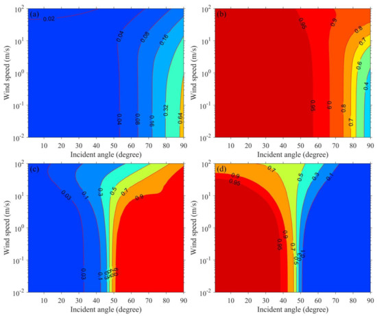 Effects of the wind-driven rough sea surface. (a) The reflectivity of RAA; (b) the transmissivity of TAW; (c) the reflectivity of RWW; (d) the transmissivity of TWA.