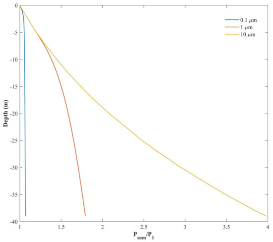 Figure 13 represents the ratio of total echo signal to single scattering with different particle radiuses. The lidar system parameters are the same as those in Section 3.1. The results show that particle sizes have a vital influence on multiple scattering of lidar. With a very small particle radius (), the ratio of total echo signal magnitude to single scattering is close to 1 at all depths, which means that the return signal is mainly dominated by single scattering, and multiple scattering does not increase with the propagation of the laser beam. When particle radius is greater, multiple scattering increases and plays a major role in the total signal. Considering the complexity of particulates in the ocean, the real particle radius should be taken into account during lidar simulation. Besides, this feature can be used for the retrieval of particulate sizes in water.