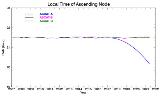 ASCAT is a C-band scatterometer with 3 vertically polarized (V-Pol) antennas transmitting pulses at 5.255 GHz. The fan-beam antennas are oriented at 45, 90, and 135 degrees with respect to the satellite track [16]. The antennas extend on either side of the instrument, resulting in a double swath of observations, each about 500 km wide separated by a gap of about 360 km. The Local Time of Ascending Node (LTAN) for the three scatterometers in the nominal and extended phases of the missions has been approximately 9:30 p.m., with a “Trident” orbit configuration to minimize orbital gaps until a recent shift to a “Tristar” configuration since ASCAT-A started a deorbiting phase, which has caused it to shift to an earlier LTAN (Figure 1) [17]. More information on the ASCAT instrument is available from [16,28,29].