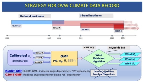 The Ku-band (13.4 GHz) scatterometer QuikSCAT [15] played a pivotal role at the beginning of the Ocean Vector Wind (OVW) CDR, by offering a “backbone” with a decade of uninterrupted and stable observations from one single sensor between 1999 and 2009. The methodology to develop a Ku-band CDR is described in detail in Ricciardulli and Wentz [7,8].