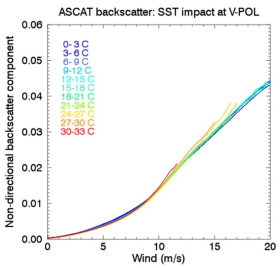 ASCAT non-directional backscatter coefficient, stratified in 3 °C SST bins, determined from 10 years (2007–2016) of ASCAT-A backscatter observations binned using Reynolds OISST, for a sample incidence angle of θ = 54° (such as for QuikSCAT V-Pol). Only data with sufficiently populated bins (greater than 100 data points) are displayed here. No significant SST-dependency was found at C-band (ASCAT), unlike with Ku-Band [57].