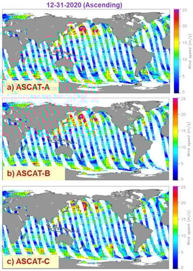 The same GMF (C-2015) has recently been used to process data from the newer ASCAT scatterometers on MetOp-B, and -C with the same wind algorithm (V2.1), for the entire duration of each mission. A small update to ASCAT-A (V.2.1.1) was recently processed to correct small calibration issues experienced after 2016 and is described in the Section 4. Figure 5 illustrates the vector wind fields for ASCAT-A, B, and -C for a sample day, 31 December 2020. A large extratropical storm is seen in the Northern Pacific, much larger than the scatterometers’ swath width. The combination of three near-simultaneous views from the three scatterometers provides a complete view of large storms.