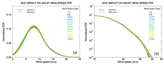Unlike QuikSCAT, ASCAT observations are taken at a wide range of incidence angles. Climate-quality data records require the wind retrievals to be highly accurate at all incidence angles. Figure 6 illustrates the wind Probability Distribution Functions (PDFs) of ASCAT-A wind speeds (solid lines) for a sample year (2016) stratified by Wind Vector Cell (WVC) as displayed by different colored lines, for winds speeds from 0–20 m/s (linear scale), and separately for higher wind regimes (log-scale). Additionally displayed are the PDFs for collocated GMI wind speeds (dashed lines), also stratified by the ASCAT-A WVC. These curves overlap at all WVC without any additional adjustment, suggesting that the ASCAT wind retrievals do not depend on the WVC position, at all wind regimes, confirming a well-designed GMF at all regimes and incidence angles.