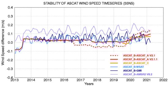 After processing the three ASCATs as V2.1, we performed a careful analysis of their cross-calibration, at global yearly, monthly, daily, and hourly scales, in order to properly estimate and possibly diagnose the reasons for any calibration instabilities. Some small but non-negligible instabilities were found for ASCAT-A. Figure 7 illustrates the calibration analysis where we compared ASCAT-B to the other ASCATs (-A and -C) and to stable radiometer wind datasets from GMI, WindSat, and AMSR-2, for global (55S-55N) monthly collocated averages from 2013 until present. This analysis proved that after the first 6-months of the mission, ASCAT-B has been extremely stable and therefore can be considered as a calibration target for all other sensors. Similarly, after the first 6-months, ASCAT-C has been extremely stable, with just a small bias of 0.05 m/s compared to ASCAT-B. On the other hand, ASCAT-A V2.1 (dashed red curve) experienced two step-changes: one in mid-2016 and a second (accidental) one at the end of 2019 followed by a small drift.