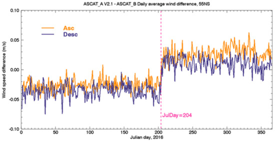 We investigated these step-changes/drifts. It was found that the +0.08 dB correction (see Section 3.4) on ASCAT-A σ0 was accidentally turned off when the code was adapted to process ASCAT-B and -C in October 2019. This is what caused the artificial ASCAT-A V2.1 calibration step-decrease in 2019. The calibration step-increase seen in 2016 is illustrated in more detail in Figure 8, which shows the daily global average differences between collocated V2.1 ASCAT-A and ASCAT-B in 2016, separately, for ascending and descending passes. The jump appeared on Julian day = 204 (22 July 2016), immediately after some missing ASCAT-A orbits on that day. According to KNMI mission log for 2016: “the ASCAT-A winds have been unavailable on 22 July between 0:21 and 10:11 UTC sensing time due to a spacecraft anomaly” (see https://scatterometer.knmi.nl/ascat_osi_25_prod/#modifications, accessed on 12 July 2021). We concluded that this calibration jump is real. We therefore reprocessed all ASCAT-A since the beginning of 2016 and applied an adjustment of −0.05 dB to the σ0 from the L1B files starting on 22 July 2016, and restored the +0.08 dB adjustment which was accidentally turned off in October 2019. The new adjusted version is referred to as ASCAT-A V2.1.1, and its cross-calibration with ASCAT-B is displayed in Figure 7 (solid red curve). A very small residual jump of about 0.02 m/s in the timeseries of the differences between -B and -A is apparent in mid-2017, but at this time we consider it too small to justify any correction. The small drift after 2019 is still visible, and it is still under investigation. No additional adjustment or post-hoc corrections are applied to ASCAT-A or the other two ASCAT scatterometers.