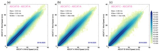 Joint PDFs of ASCAT-B versus A (a), -C versus -A (b), and -C versus -B (c), collocated within 60 min over the period 2019–2020. To facilitate the comparisons of different pairs of instruments, the joint PDFs are normalized to the total number of observations, which were binned in 0.1 m/s intervals. The cyan dashed line displays the average bias between each pair of wind datasets. The thin back dotted line represents the diagonal, as a reference for unbiased data.