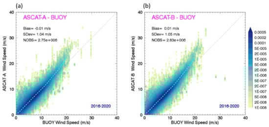 Surface ocean winds from the network of global buoys described in Section 2.2 provide an independent verification dataset for the absolute calibration of the ASCAT scatterometers. Note that the buoys have not been used in the development of the GMF or the wind retrievals algorithm. As the in situ measurements are sparse, a large sample needs to be considered in order to verify the calibration in a wide wind speed range. Figure 10 displays the joint PDFs for ASCAT-A and -B collocated within 30 min and a radius of 25 km from the actual buoy location at a given time, as they occasionally move from their nominal location, during the period 2016–2020. Both scatterometers are unbiased with respect to the buoy wind speeds in the range 0–15 m/s. A small bias appears at higher wind speeds as the buoys become less reliable in very rough ocean conditions. The standard deviation between ASCAT and the buoy measurements is of the order of 1 m/s, with an uncertainty approximately equally shared between the two types of instruments. Note that the Standard Deviation for comparisons between ASCATs is of the order of 0.5 m/s (Figure 9).