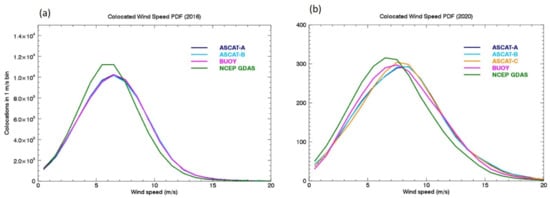 A finer verification of the absolute calibration is achieved by collecting a set of quadruple collocations: ASCAT-B (swath data L2B) is first collocated with the buoys within 30 min and 25 km; then, for a more time-efficient search, this selection is collocated with ASCAT-A measurements from the gridded dataset (L3), and within 60 min, to ensure an overlap between the two scatterometers (see Figure 1 for the LTAN). Finally, NCEP GDAS winds are interpolated to the ASCAT-B time and location. The wind speed PDFs for this set of quadruple collocations for the year 2016 are displayed in Figure 11a. There is excellent alignment between the ASCAT and the buoy wind PDFs. The alignment is due to the accurate GMF (the PDFs have not been aligned by any post-hoc adjustment to the wind retrievals). The NWP wind PDFs are narrower and slightly shifted towards lower winds. This is because these PDFs are built by interpolating the lower spatial and temporal resolution NWP, in this case the NCEP GDAS 1 deg, 6-hourly wind fields, to the ASCAT-B location. Similarly, in Figure 11b, the wind speed PDFs for quintuple collocations in 2020 are displayed, which additionally include ASCAT-C. The statistics for the collocated data for 2016 and 2020 are summarized in Table 1. The alignments between the buoys and the three ASCATs is still very good, but slightly degraded compared to Figure 11a. This is likely due to noise affecting the much smaller collocation sample in 2020 (2681 quintuple collocations in 2020 versus 74,036 quadruple ones in 2016).