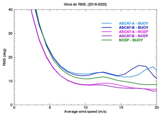 Figure 12 provides an estimate of the uncertainty in the ASCAT retrievals’ wind direction. The figure displays the wind direction root-mean-square (RMS) difference between ASCAT-A or -B and wind measurements from the buoys, collocated within 30 min during the years 2016 to 2020. The RMS difference is a function of wind speed, with wind direction RMS differences being higher at lower wind speeds. This is because the backscatter for a smooth surface (i.e., regions of low winds) is low, which leads to higher uncertainty in the wind direction retrievals. At wind speeds above 7 m/s, the directional RMS compared to buoys is 15 degrees or less. This results from the combination of the uncertainty of the scatterometers’ and the buoy anemometer wind direction measurements. When compared to the NCEP model, the ASCAT RMS at winds above 7 m/s is reduced to about 10 degrees. This is possibly due to the fact that the NCEP model assimilates the ASCAT retrievals, though not this specific dataset. On the other hand, wind direction from a point-source instrument such as the buoy anemometer is expected to present larger differences with those from space-based observations. Larger differences are also observed when the buoy wind direction is compared to those from the NCEP model, interpolated to the buoys’ location and time.