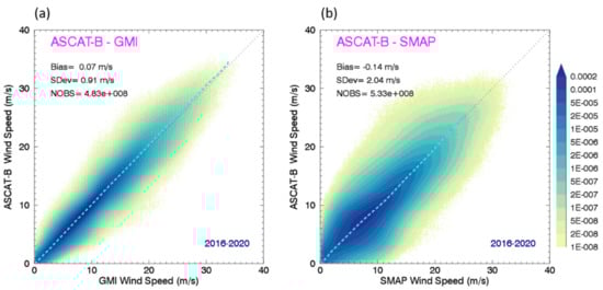Joint PDFs of ASCAT-B versus GMI (a) and SMAP (b) radiometer winds, for rain-free retrievals over the period 2016–2020. The collocations are found within a 90-min window for GMI, and within a 4-h window for SMAP. The large SMAP collocation window is due to the different LTAN. The joint PDFs are normalized to the total number of observations, which were binned in 0.1 m/s intervals.