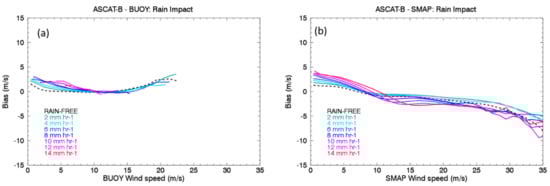 Rain can affect the consistency of wind retrievals obtained from scatterometers operating at different frequencies: it affects both direct and backscattered signals due to backscatter from the rain drops (positive wind bias at low winds) and atmospheric attenuation (negative bias at high winds). Additionally, rain can alter the ocean surface roughness via a “splash” effect (small positive bias at low winds), and can cause an artificial rotation of the retrieved wind vectors [22,64]. The impact of rain on wind measurements is proportional to the rain intensity, and is more relevant for sensors operating at higher frequencies. We studied its impact by comparing winds in rain from the C-band ASCAT scatterometers to wind measurements from buoys and the SMAP radiometer, which are either unaffected or minimally affected by rain. Previous studies documented the rain impact for different frequency bands, using comparisons with NWP and buoy measurements. The studies found the rain impact to be minor at C-band [65,66,67], significant at Ku-band [7,68,69] especially at low winds, and negligible at L-band [8,48,63].