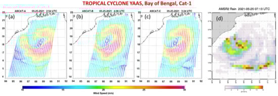 Panels (a–c): Surface wind vector fields for Tropical Cyclone Yaas in the Bay of Bengal as seen from ASCAT-A (a), -B (b), and -C (c) on 25 May 2021 (descending passes). The combination of the three scatterometers provides a consistent and complete view of the tropical cyclone, between 3–4 AM (UTC). Panel (d): Rain rate for TC Yaas, as observed by AMSR-2 on 25 May 2021, 0713 UTC, a few hours after the ASCAT passes. Notice the rain band at the bottom, which corresponds to the area where ASCAT shows a narrow band of convergence along with a small area of divergence to the Eastern edge, possibly associated with updrafts/downdrafts in the rain band.