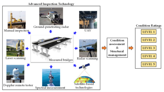 The main content of highway bridge inspection includes appearance inspection, internal inspection, mechanical performance evaluation and geometric parameter inspection. Advanced inspection technology, such as UAV [17], radar scanning [15], infrared thermal imaging [16], spectral measurement, doppler remote tester, and laser scanning [45], has significantly increased the accuracy and efficiency of inspection works, shown in Figure 1. Based on the inspection results and corresponding codes, the structural condition could be determined as different condition levels.
