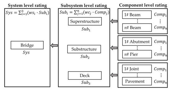 Based on the Chinese code, condition ratings of small- and medium-span bridges are derived from the annual bridge inspections, and they are the basis for bridge condition assessment and management decision making. In China, the ratings include a structural evaluation of system level, unit level, and component level on a 1–5 scale, shown in Figure 2. The structural components are firstly rated based on the inspection results and associated standards. The rating of the unit is weighted by the ratings of its components, and the rating of the bridge system is weighted by the ratings of the units. As the types of bridge components in the area are diversified and the systems and units are similar, this paper aims to reveal the deterioration features and plan the maintenance works based on the ratings of bridge systems and units.
