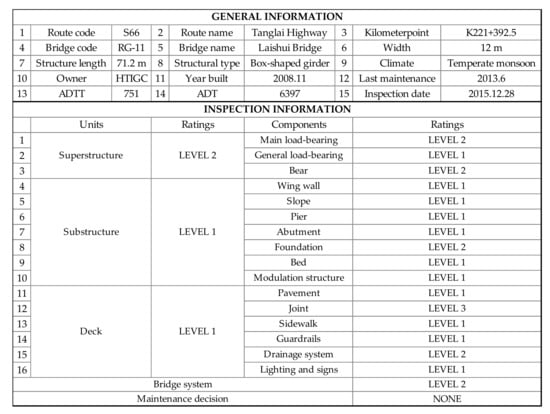 Inspection reports of bridges in China mainly record the current condition ratings of structures and components at each inspection. Some structural general information is also depicted in the inspection reports. A translated inspection report sample is shown in Figure 3. The bridge general information contains route code, route name, kilometer point, bridge code, bridge name, width, structure length, structure type, climate, owner, year built, last maintenance, average daily truck traffic (ADTT), average daily traffic (ADT), and inspection date. Some of them are condition-related parameters, and they are of great importance in understanding the deterioration process of the regional bridges. For example, ADT represents the daily traffic volume of the inspection bridge, which could reflect the effect of the vehicle loadings. In addition, as too many heavy trucks often have a greater impact on the condition of the bridge, ADTT is another important parameter that reflects the loading effects. The detailed selected parameters used to train the regional deterioration models are illustrated in the next section.