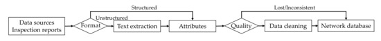 This study proposes a procedure to assemble these data into a uniform and machine-readable format. The regional database can be established with the procedure illustrated in Figure 4. The preserved human error and data missing impact the analysis accuracy and efficiency. The continuity and accuracy of data could be influenced by improper paper storage and broken electronic documents. Even for the preserved documents, it is difficult to unify these formats due to poor management and changing standards. Moreover, several data points are obtained through manual behaviors, which can lead to subjectivity, human error, etc. It is necessary to conduct data cleaning techniques to improve data quality. A common solution is using the redundant data of the same bridge from different sources to check the data correctness. Then, based on the data extraction and cleaning techniques, the regional bridge database can be established.