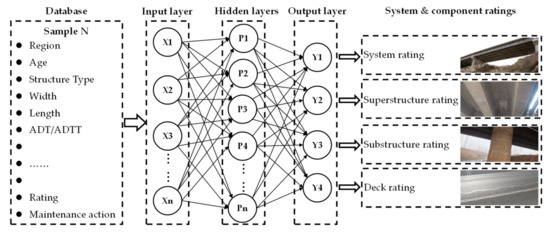 For aging structures, the deterioration model usually plays a significant role in the estimation of the structural condition. Deterioration models should correctly describe the deteriorating effect and its variation over time. To describe the complex relationship among the regional features and structural conditions, an NN is employed to establish the deterioration model of regional bridges. NN could implicitly extract complex nonlinear relationships between dependent and independent variables, and detect all possible interactions between predictor variables. The overview of established NN for regional bridge condition assessment is shown in Figure 5.