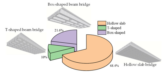 Short- and medium-span beam bridges are one of the most common types of bridges throughout the world [26,27,28]. There are three main types of concrete beam bridges, that is, box-shaped beam bridges, hollow slab bridges, and T-shaped beam bridges. Each type of bridge has common characteristics, such as regular configurations, definite force transmission mechanisms, and comparable maintenance strategies [29,30]. In addition, damage location and crack directions are also typical for the same type of bridges. These similarities also contain regional deterioration characteristics and maintenance action effects.