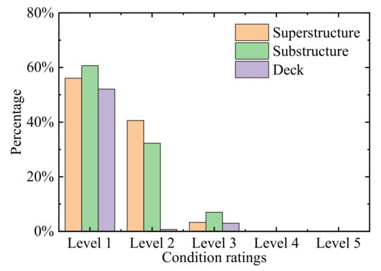 Figure 8 compares condition ratings of bridge main components (superstructure, substructure, and deck) in different sub-regions. The data is extracted from the bridges with an age of 5, which covers nearly 1000 measured bridges. According to Chinese rating codes, there are five condition levels for inspected bridge where Level 1 denotes bridges in the best condition. As we can see, nearly all of the inspected bridges in Hebei Province are categorized as either Level 1 or Level 2, which means most of the bridges remain in nearly intact or slightly damaged condition, which is likely due to continuous regular maintenance. The number of bridges in the low-condition zone is small. They might contain some potential risks that affect the service capacity of the transportation network and warrant more attention. By comparing all three components, it can be seen that the bridge deck is the most damaged structure. As these bridge components are directly exposed to both traffic wheels and the environment, the deck is more vulnerable than other bridge components.