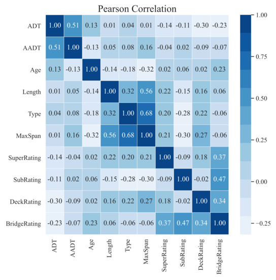 Features used for deterioration models are listed in Section 4.1. A correlation matrix is a tool to investigate the potential relationships between two variables. Figure 9 summarizes correlation coefficient values of parts of the selected features. An absolute correlation coefficient value close to 1 indicates that the correlation between two variables is strong. It can be seen that the maximum absolute correlation coefficient value is 0.68 which is the correlation between “Structural type” and “Max span”. Other pairs of variables whose absolute correlation coefficient value slightly exceeds 0.5 are “ADT” and “AADT”, and “Length” and “Max span”. However, the correlation between these variable pairs is still not strong. Moreover, most of the variable pairs listed here have low absolute correlation values. It is worth noting that the features selected to be trained in the database are statistical independently.