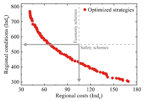 Groups of bridges need to be well managed with a limited resource. Therefore, the cost indicator and safety indicator defined in this study corresponding to the regional management scheme should be the simultaneously minimized. Figure 10 shows optimal maintenance schemes (red points) for this transportation network. Each point represents an optimal solution that satisfies the given constraints and objectives. There are 122 optimal maintenance schemes selected from the genetic evolution. A total of 86 schemes belong to economy maintenance schemes, and 68 maintenance schemes belong to safety schemes.