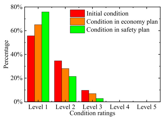 Figure 11 compares the condition rating distributions of the previous year, the next year with economy scheme, and the next year with safety scheme. The initial condition rating distribution is marked with red bars. Among these three conditions, the initial condition of Level 1 bridges accounted for the least proportion, and the proportion of Level 2 and Level 3 bridges is the largest. After the maintenance actions implemented, the overall bridge ratings are improved in both the economy scheme (41.95, 737) and safety scheme (158.205, 319). The economy plan, which is marked as orange bars in Figure 11, moderately increases the overall condition level with less maintenance actions. It requires less budget. The safety scheme (red bars in Figure 11) maintains most of bridges in the best condition, but the total budget may be excessive. Nearly 80% of bridges are maintained at Level 1. The optimal maintenance schemes in Figure 11 could be chosen to improve the overall conditions, according to actual structural conditions, management requirements, and total budget.