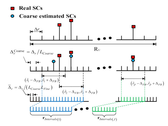 To give the sparse GTD model, a uniform discretization in is carried out []. Based on the achieved , a more precise one-dimensional uniform grid is conducted. Then, the is subdivided into L range cells, leading to a finer sampling range interval . Accordingly, the total number of range cells becomes in .