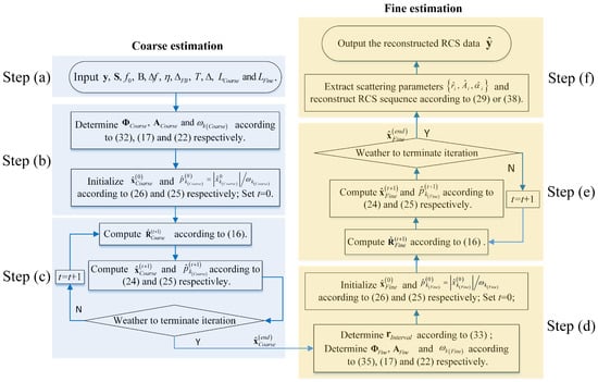 The second step is to estimate the scattering parameter. There are three main ways to obtain the scattering parameter estimation (SPE) of the GTD model. As a kind of general method, the modern spectrum estimation technique has been applied at an earlier time [,,]. However, this kind of method cannot deal with non-uniform and incomplete data. Probabilistic-based Maximum Likelihood Estimation (MLE) is another kind of effective method for SPE [], in addition to the Approximate Maximum Likelihood (AML) algorithm, the Coherent Particle Swarm Optimization (CPSO) algorithm [], the RELAX algorithm [], etc. However, this kind of method needs huge computing resources, and its solutions are sensitive to the initial value of the iteration. Due to the fact that SCs are sparsely distributed in radar targets at high frequency, the sparse recovery methods can be utilized for SPE [,,,]. These methods can be subdivided into three major classes: the greedy pursuit method [], the convex relaxation method [], and the sparse Bayesian learning method []. The greedy pursuit method extracts a non-zero component in each iteration, and provides a fast solution with a low computational cost. Yet, the convergence is not guaranteed. The convex relaxation method has good performance in sparse recovery and has been widely applied in biomedical imaging and radar imaging. However, the performance of this method is sensitive to the selection of the auxiliary parameter. The sparse Bayesian learning method can avoid the selection of auxiliary parameters and can achieve high precision recovery, whereas it needs to assume the noise s probability distribution in advance. In practice, the assumption of the noise s probability distribution is sometimes inappropriate. The last step is to calculate the RCS data. Theoretically, with the adopted scattering model and the estimated scattering parameter, the RCS data at any frequency in the bandwidth can be reconstructed. In this paper, we only consider the reconstruction at stepped frequencies.