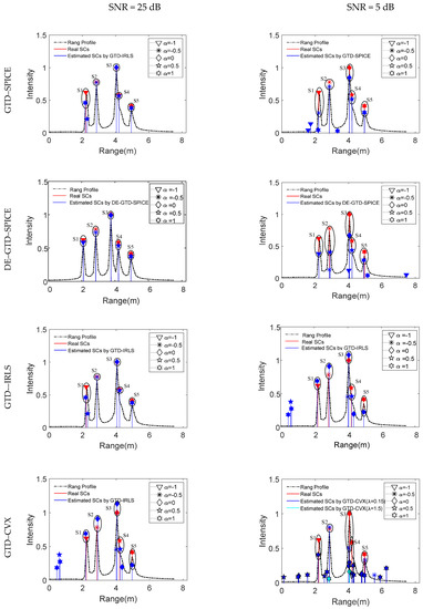 Compared with the case of SNR = 25 dB, the SPE results of the four methods under SNR = 5 dB are poorer. The SPE results of the five SCs by the GTD–SPICE method are basically consistent with the true values. It is seen that the scattering locations of the five SCs are correctly extracted. The scattering types of S2, S3, S4, and S5 are correctly judged, except that the scattering type of S1 is misjudged as . The scattering intensities of S2, S3, S4, and S5 are also close to their true values. The deviation of the estimated scattering intensity of S1 is up to 0.31, which is the maximum deviation among all SCs. In addition, there are four fake estimated SCs whose intensities are smaller than 0.1. The SPE results obtained by the DE–GTD–SPICE method are less accurate than that of the GTD–SPICE method. The scattering locations and scattering types of the five SCs are correctly estimated; however, the deviations of the scattering intensities of the five SCs are all larger than 0.1, and the maximum deviation of the estimated scattering intensity reaches 0.34. Also, there are four fake estimated SCs.