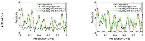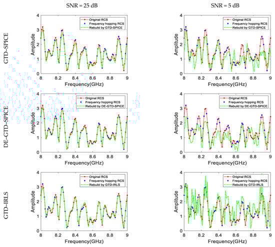 Numerical simulations on different , SNRs, and FHRs are carried out to evaluate their performance, respectively. The GTD–CVX method and the GTD–IRLS method are used for comparison. Results show that the performance of the GTD–SPICE method and the DE–GTD–SPICE method are comparable to the GTD–CVX method, with the best auxiliary parameter, which outperforms the GTD–IRLS method. However, the GTD–CVX is sensitive to the auxiliary parameter. Without a good selection of the auxiliary parameter, its RCS reconstruction result is poor and cannot be used. Compared with the GTD–CVX method, the proposed GTD–SPICE method and the DE–GTD–SPICE method are non-parametric. Thus, the two methods can accomplish reliable RCS reconstruction. In addition, both the methods can achieve accurate RCS reconstruction.