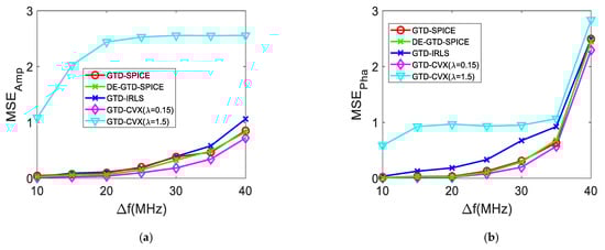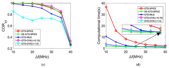 As shown in Figure 7d, with the increase of , the computational time of the GTD–SPICE method, the GTD–IRLS method, and the GTD–CVX method gradually decreases. This is due to their computational complexity decreases with the decrease of , which is consistent with (40). The GTD–SPICE method requires the longest computational time of about 37s when . It is more than three times and six times of that of the GTD–IRLS method and the GTD–CVX method, respectively. When ranges from 10 MHz to 30 MHz, the maximum computational time of the DE–GTD–SPICE method is about 3 s, which is only around 8.12% of that of the GTD–SPICE method, which indicates that the DE–GTD–SPICE method can reduce computational time compared with the GTD–SPICE method. It is also seen that when , the computational time of the DE-GTD method has a slight increase as the increase of . The reason for this phenomenon will be explained in Section 5.2.4.