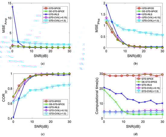 As can be seen in Figure 8a, when SNR < 6 dB, the of the GTD–SPICE method, the DE–GTD–SPICE method, and the GTD–CVX method is much smaller than that of the GTD–IRLS method. When SNR > 6 dB, the of the four methods is almost the same. As shown in Figure 8b, when SNR < 12 dB, the of both the GTD–SPICE method and DE–GTD–SPICE method is slightly smaller than that of the GTD–CVX method and much smaller that of the GTD–IRLS method. In contrast, when SNR > 12 dB, the of the four methods is quite close and tends to be 0, except that the of the GTD–IRLS method is slightly larger than 0 when SNR is from 20 to 30 dB. It is seen in Figure 8c that when SNR < 10 dB, the of the GTD–SPICE method and the DE–GTD–SPICE method is slightly larger than that of the GTD–CVX method and much larger than that of the GTD–IRLS method. When SNR > 10 dB, the of the four methods is almost equal and quite close to 1, except that the of the GTD–IRLS methods is a little smaller than 1 when SNR is from 20 to 30 dB.This indicates that the two proposed methods outperform both the GTD–CVX method and the GTD–IRLS method under low SNR conditions, and have a slight advantage under high SNR conditions.
