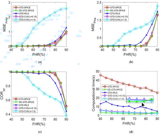 It can be seen in Figure 9a–c that the and increase with the increase of FHR, and the of the four methods decreases with the increase of the FHR. It is seen that the GTD–CVX () method is much more accurate than the GTD–CVX () method. This also shows that the selection of the auxiliary parameter is the key to the performance of the GTD–CVX method.