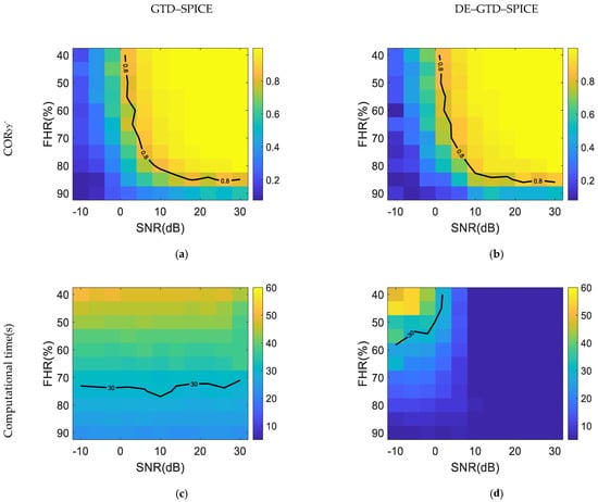 Lastly, the joint impacts of , SNR, and FHR on the proposed methods in RCS reconstruction are analyzed. Since the performance of the GTD–SPICE method and the DE–GTD–SPICE method in RCS reconstruction is related to , SNR, and FHR, it is difficult to determine which , SNR, and FHR are more efficient. Considering the above findings that the performance of the proposed method has similar trends in terms of and FHR, only the SNR and FHR are performed jointly in this experiment. The SNR ranges from 10 dB to 30 dB with an interval of 4 dB, and the FHR ranges from 40% to 90% with an interval of 5%. Similarly, the Monte Carlo simulation with 50 trials is used. The averages of the and the computational time of the two proposed methods are shown in Figure 10a–d, respectively.