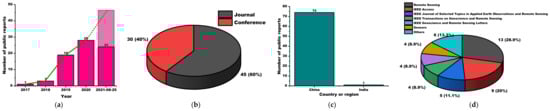 Moreover, we provide some statistical analysis in Figure 2. From Figure 2a, the number of public publications has increased year by year. The highest growth rate was in 2019. The growth rate slows down slightly in 2020, which may be because of the influence of the successive releases of other datasets. By 25 August 2021 (the completion time of this manuscript), there have been 24 public reports using SSDD. As one can imagine, there must be >28 public reports from 2020 that will appear throughout 2021. From Figure 2b, the studies using SSDD are active in both peer-review journals and conferences, showing SSDD’s great influence. From Figure 2c, except for one conference report from the Indian scholars’ Anil Raj et al. [87], all reports are from Chinese scholars. This may be because (1) the publisher of SSDD Jianwei Li is from China; (2) SSDD was firstly released at the conference of the BIGSARDATA in Beijing, China; (3) it was in Beijing, China, at the 2016 IGARSS conference where the first report from C.P. Schwegmann et al. [23] applied DL to SAR ship detection, although they [23] did not use SSDD. Therefore, China has become the most active country or region in research.