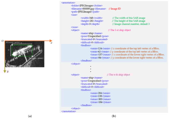 The label of BBox-SSDD where we take the PASCAL VOC format to introduce. (a) BBox in a SAR image; (b) xml annotation details.